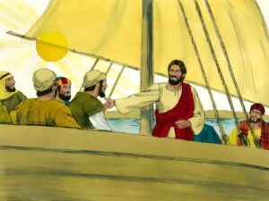 “耶稣在加利利海边行走,看见弟兄二人,就是那称呼彼得的西门和他兄弟安得烈,在海里撒网。他们本是打鱼的。耶稣对他们说:‘来跟从我,我要叫你们得人如得鱼一样。’他们就立刻舍了网,跟从了他。从那里往前走,又看见弟兄二人,就是西庇太的儿子雅各和他兄弟约翰,同他们的父亲西庇太在船上补网,耶稣就招呼他们。他们立刻舍了船,别了父亲,跟从了耶稣。”