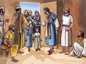 35-36节说,耶稣坐下,领了一个小孩子来,意思是在说:我告诉你们谁能代表我,不是你们中间最大的,而是这个小孩子。37节说:“凡为我名接待一个像这小孩子的,就是接待我。”