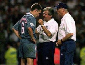 所以,有人留意到这一幕是什么原因?原来这个英国队的经理22年前他也是球员,原来22年前也是在世界杯的时候,当年英国对德国,他罚点球没踢进去,结果他也崩溃了。(图1)但是他球队的经理特意跑来安慰他说:“没事的”。