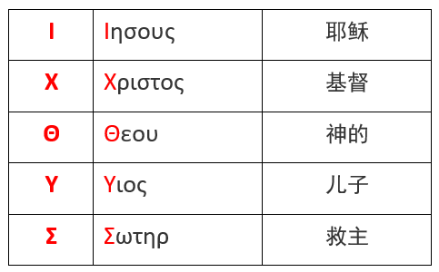 所以希腊字“鱼”成了这五个希腊字的首字母缩写字。每个字母各代表了一个希腊字:耶稣,基督,神的,儿子,救主。因为θεου是属格(即“属于神的”),所以正确的解读是:耶稣是基督、神的儿子、救主。这个缩写字就成了基督徒信仰宣告的记号。