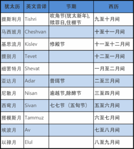犹太历法与中国历法一样都是阴历,即每月开始时是新月。通常一年有十二个月、约有354日。但因为阴历的十二个月比阳历的一年(太阳绕地球一周为一年)少十一日,所以每隔三年左右便要加一个闰月,调正节令。犹太人的宗教历正月是尼散月(约于西历3月至4月期间),但犹太人的民事历新年是在提斯利月(即宗教历七月、约于西历9月至10月期间)。